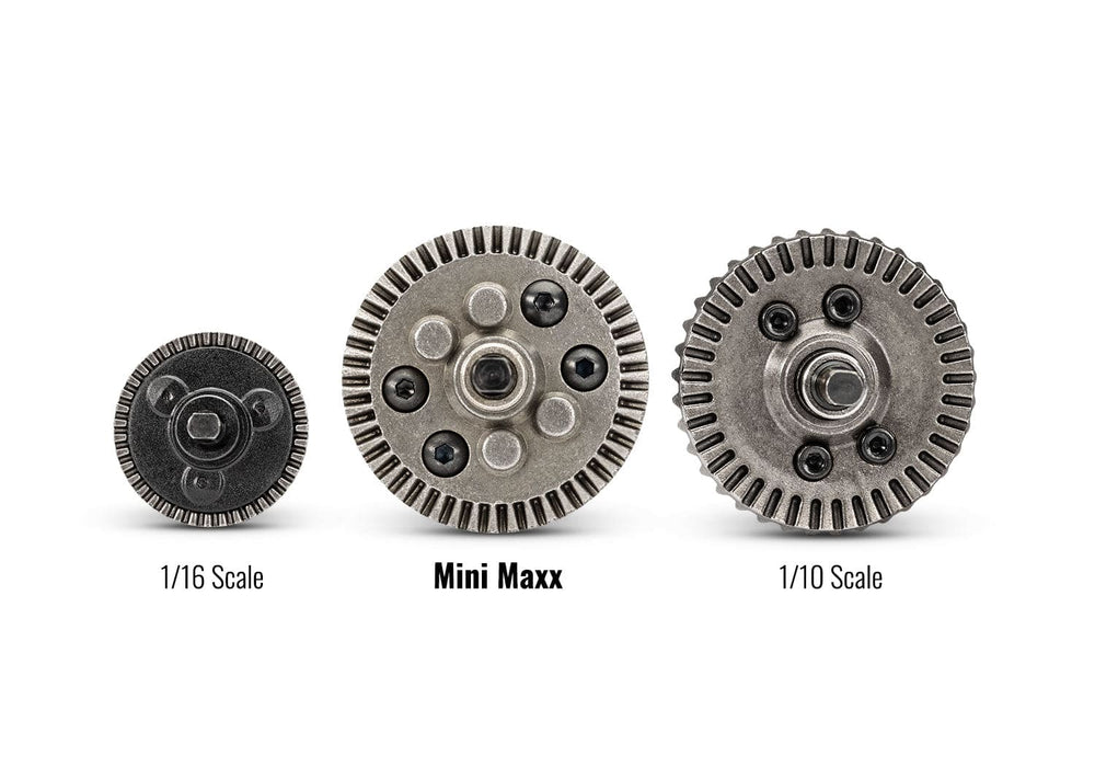 Mini Maxx is engineered to a higher standard with 1/10 scale 4X4 driveline components. Large steel- gear differentials, beefy 32-pitch gears, and heavy-duty U-joint driveshafts far exceed requirements for strength and long life.