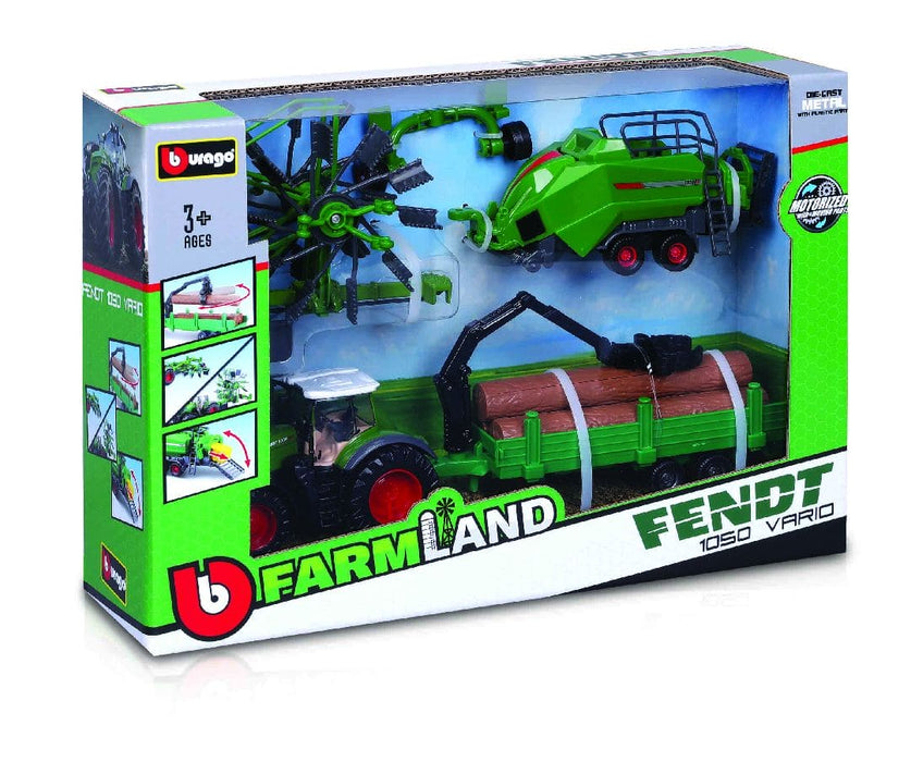 BUR18-31668 Bburago Farmland 10cm Moto. Tractor w/ 3 Trailers Gift Set (6)