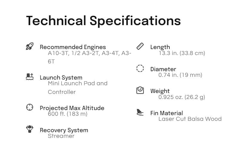 Equipped with a reliable streamer recovery system, the Ripley is built for both excitement and safety. The streamer gently slows the rocket's descent, making recovery a breeze and allowing for thrilling launches again and again! Whether you're launching in a wide-open field or a smaller area, the Ripley is perfect for any setting!