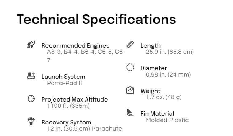 - Projected Max Altitude: 1100 ft. (335 m) on a C6-5 Engine