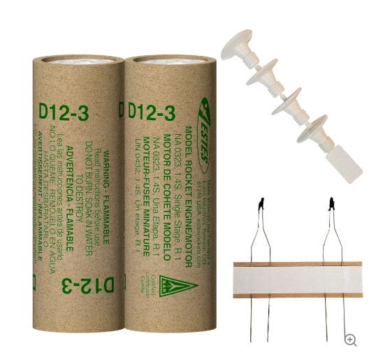 The Estes D12-3 engine is a single stage engine designed for model rocket flight. This engine is a 24mm diameter engine designed for rockets with a maximum lift weight of less than 14 ounces. Each package includes 2 engines, 2 starters and 4 starter plugs.