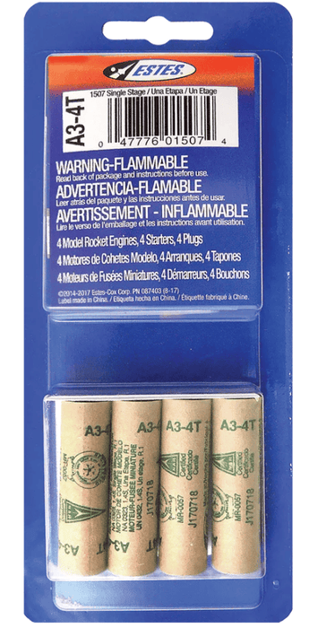 The Estes 1/2A3-4T engine is single stage engine designed for model rocket flight. This engine is a mini engine designed for flights in lightweight rockets. Each package includes 4 engines, 4 starters and 4 starter plugs.