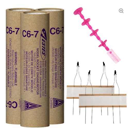 The Estes B6-7 engine is an upper stage engine designed for model rocket flight. This engine can also be used as a single stage engine in lightweight rockets. Each package includes 3 engines, 4 starters and 4 plugs.