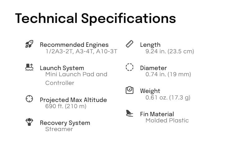 Equipped with a streamer recovery system, the Mini Alpha ensures a safe and controlled descent back to Earth, ready for another exciting launch!