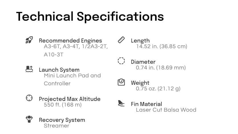 Equipped with a Mylar Streamer recovery system, the Mini Arcas ensures a safe and reliable return after each launch. When using mini engines (13mm), the Mini Arcas can soar to an impressive altitude of 550 feet!