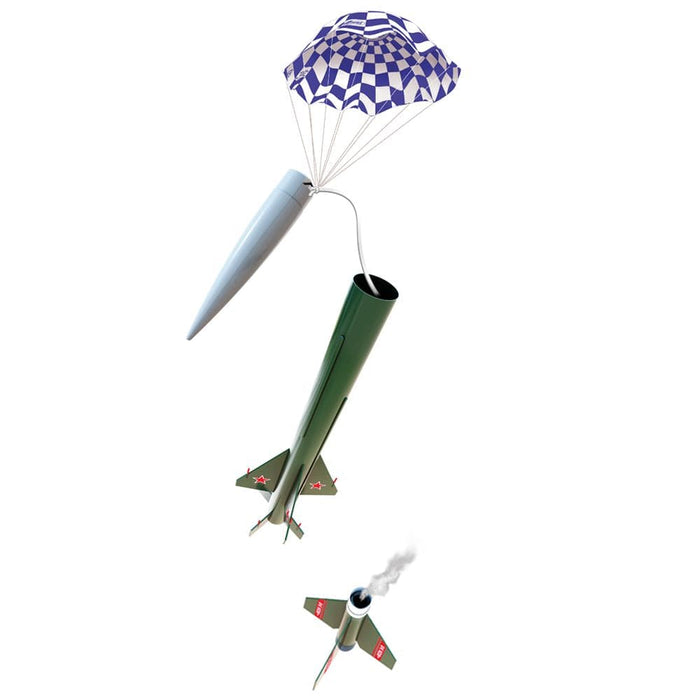Durable and rugged this bad boy has two stages to lift the 6.1 ounce rocket into 'outer space'. Powered by two D or E engines, the Sasha can soar to 2300 feet high. An 18 inch parachute will safely return the main rocket down to earth as the booster tumbles gently down to the ground. Once grounded, this 31-inch tall rocket will command respect when on display in any hobbyist's collection.