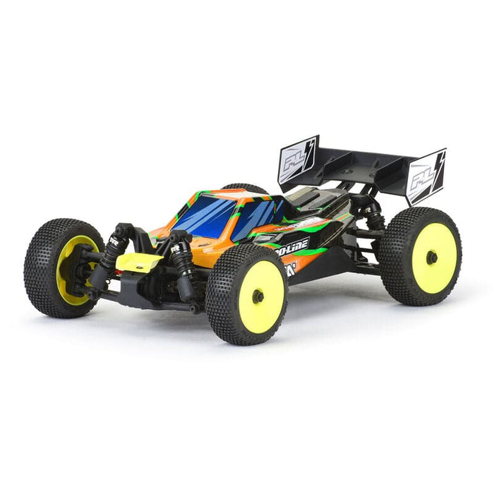 Now you can have a Pro-Line Axis body for your Typhon™ GROM to match your 1/10 version in a cool paint scheme! Designed with the latest in CAD technology, the Axis features a super low-slung design with sharp lines throughout giving it an unmistakable look on the track, and fits the Typhon™ GROM chassis perfectly. The Axis features a cab-forward design that provides enhanced steering response while the small side fins balance out the rear of the car with ideal side-bite. XT